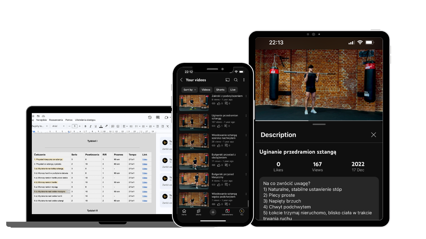 Cały plan dostępny jest w przejrzystym arkuszu, do którego masz dostęp z każdego urządzenia. Dbam o realizację Twoich celów, monitoruję postępy i pomagam Ci utrzymać pełną kontrolę nad procesem treningowym. Ta kompleksowa współpraca to skuteczne narzędzie, które pozwoli Ci osiągnąć wymarzone rezultaty.